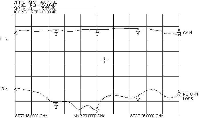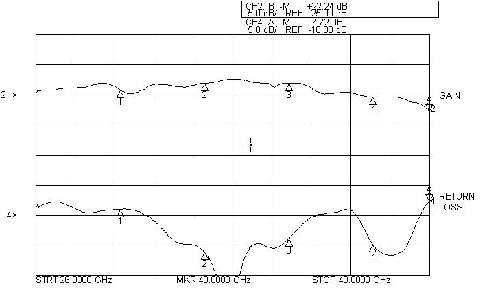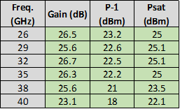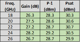 Akon millimeter amplifiers are available banded in the popular 18 – 26.5 GHz, 26.5 – 40 GHz bands, as well as broadband 18 – 40 GHz and 33 – 50 GHz. LNA noise figures are as low as 3.5 to 4.5 dB at 18 GHz and 4.5 to 5.5 dB at 40 GHz to 6.5 dB at 50 GHz. Medium Power amplifiers can provide P-1 dB outputs from +28 dBm at 18 GHz to +23 dBm at 40 GHz and +19 dBm at 50 GHz. Performance of actual units shown on the right.