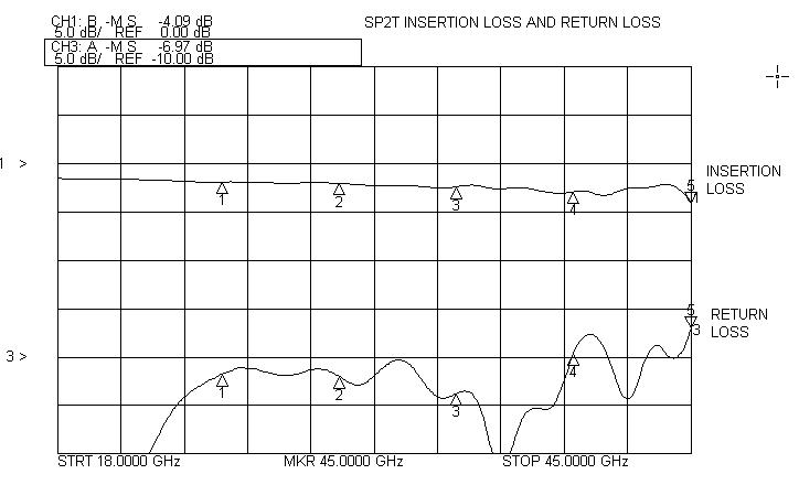 Switches are available SPST through SP8T with absorptive/reflective options, high isolation options, low insertion loss and good VSWR. Switching speed is typically 100 ns or better. Power handling is typically +23 dBm. Switch products are full band. Performance of actual units shown on the right.