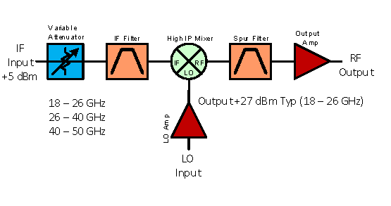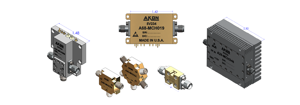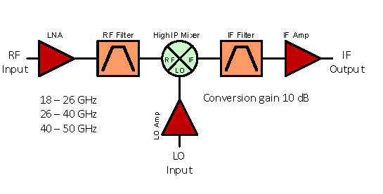 Akon millimeter band frequency conversion products operate up to 50 GHz. They consist of low noise RF amplification, RF and IF filtering, a driver amplifier on the mixer LO port and a low noise IF amplifier. Converters can be single or double conversion, depending on RF/IF relationship. Units feature low spurious mixing products and high linearity, and high image rejection. Performance of actual units shown on the right