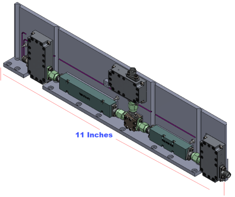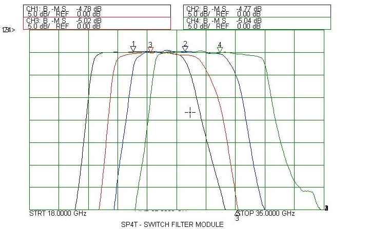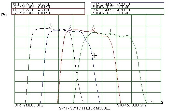 Akon millimeter band Switched Filter Banks are ultra-compact and are a marriage of our above described switching and filter technology, integrated into a single overall packaged IMA consisting of input and output multi-throw switches connected by the filter array as specified by the customer. Amplification in the filter bank is available optionally. Performance of actual units shown on the right.