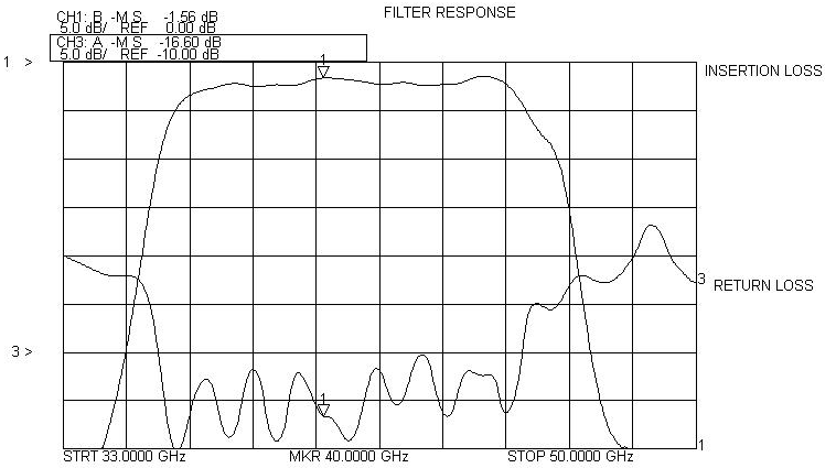 Akon ultra-compact millimeter substrate filters are printed on quartz or alumina substrates as appropriate for the frequency. These filters typically offer 2 to 3 dB of passband loss and a minimum of 35 dB of stop-band rejection. Rejection of 50 dB or more is available using a cascade configuration. Filters are available with customer specified bands. Performance of actual units shown on the right.
