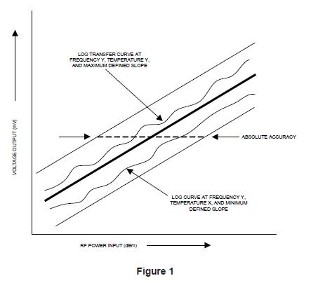 This is a measure of total power uncertainty around a fixed mathematical straight line (defined as a reference line) as the RF frequency, RF power and temperature are varied. The absolute accuracy includes the effects of log linearity, frequency, temperature variation and output D.C. offset variation and is measured in ±dBs. See Figure 1.