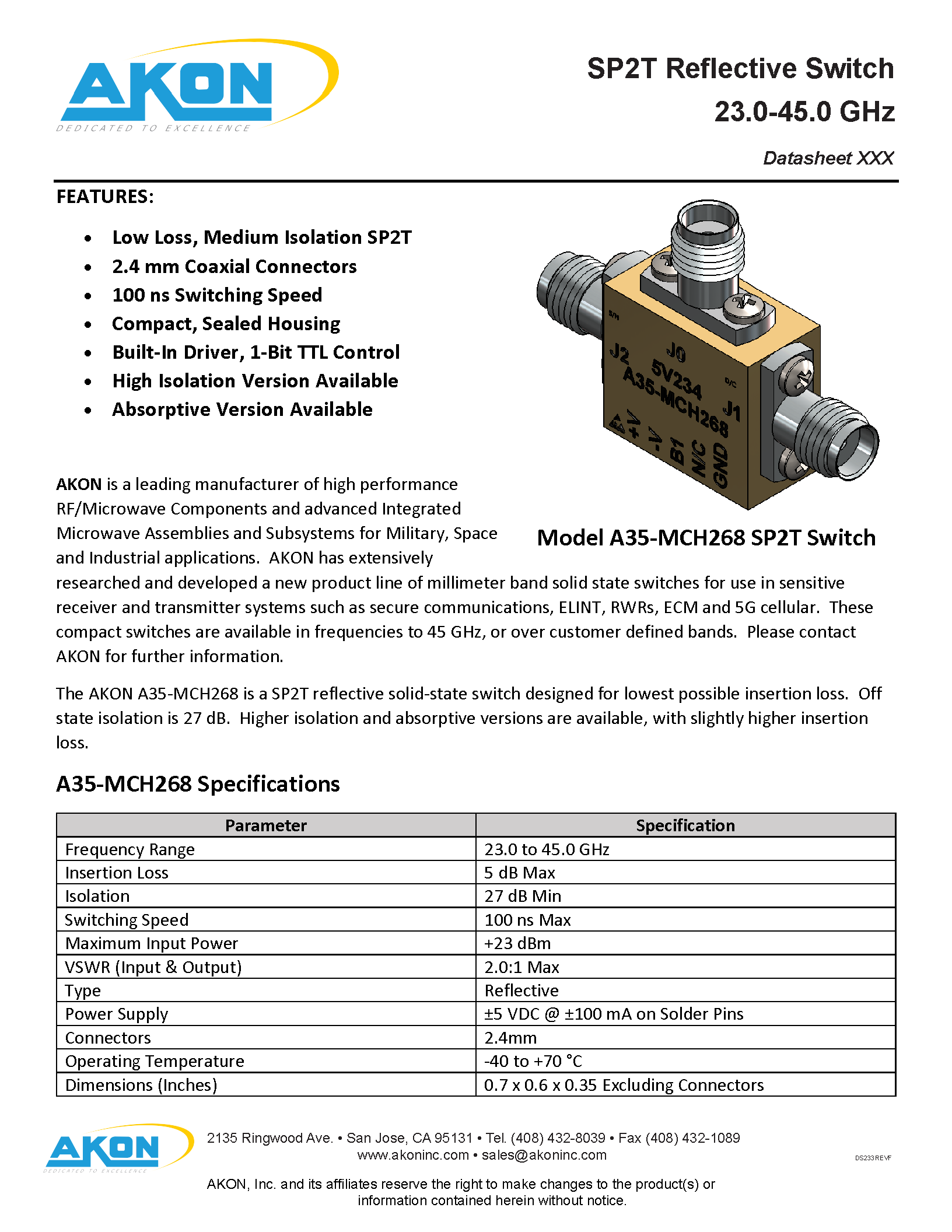 AKON, Inc. an industry leader in the development of high performance microwave components and integrated assemblies, announces a new line of solid state microwave coaxial switches operating at frequencies up to 45 GHz. The first product is a SP2T reflective switch operating 23 to 45 GHz, and is designed for lowest possible insertion loss. The insertion loss is 5 dB maximum, while the off state isolation is 27 dB minimum. Switching speed is 100 ns or better. The switches are housed in a very compact sealed enclosure with 2.4mm connectors and solder pins for DC and control. Higher isolation and absorptive versions are available, with some increase in insertion loss. Contact AKON for further information.