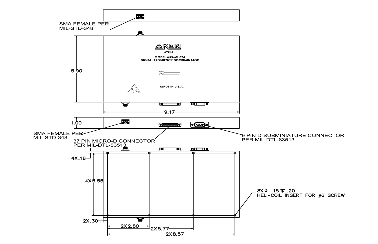 AKON is a leading manufacturer of RF, Microwave and Millimeter-Wave components and subsystems, including Digital Frequency Discriminator (D-IFM) subsystems. AKON’s DFDs are highly integrated microwave assemblies using the latest digital and microwave technologies to provide a highly accurate unit in a small volume, and also be of robust reliability for long service life in full Military environments. The AKON DFD is housed in a compact 233 x 150 x 25.4 mm package. Package is environmentally sealed against dust and moisture. The DFD provides 14 bits of digital output corresponding to the measured frequency, along with flag outputs to indicate presence of signal, valid data output and other requirements. The unit is capable of processing simultaneous signals (pulse on pulse, pulse on CW), and will provide accurate results of the stronger of the two signals if the power difference is 6 dB or more. This particular model features both internal as well as external signal triggering modes, which are user selectable. In the internal trigger mode, the unit will automatically sense the presence of an incoming pulse which is above the threshold level and make a frequency measurement. In the external trigger mode, the unit will attempt to make a frequency measurement every time it receives an externally applied trigger pulse. Maximum external trigger frequency is 40 MHz. AKON has other models of DFDs which cover narrower frequency bands and therefore provide increased frequency accuracy. Please contact your local AKON representative or AKON directly for more information.