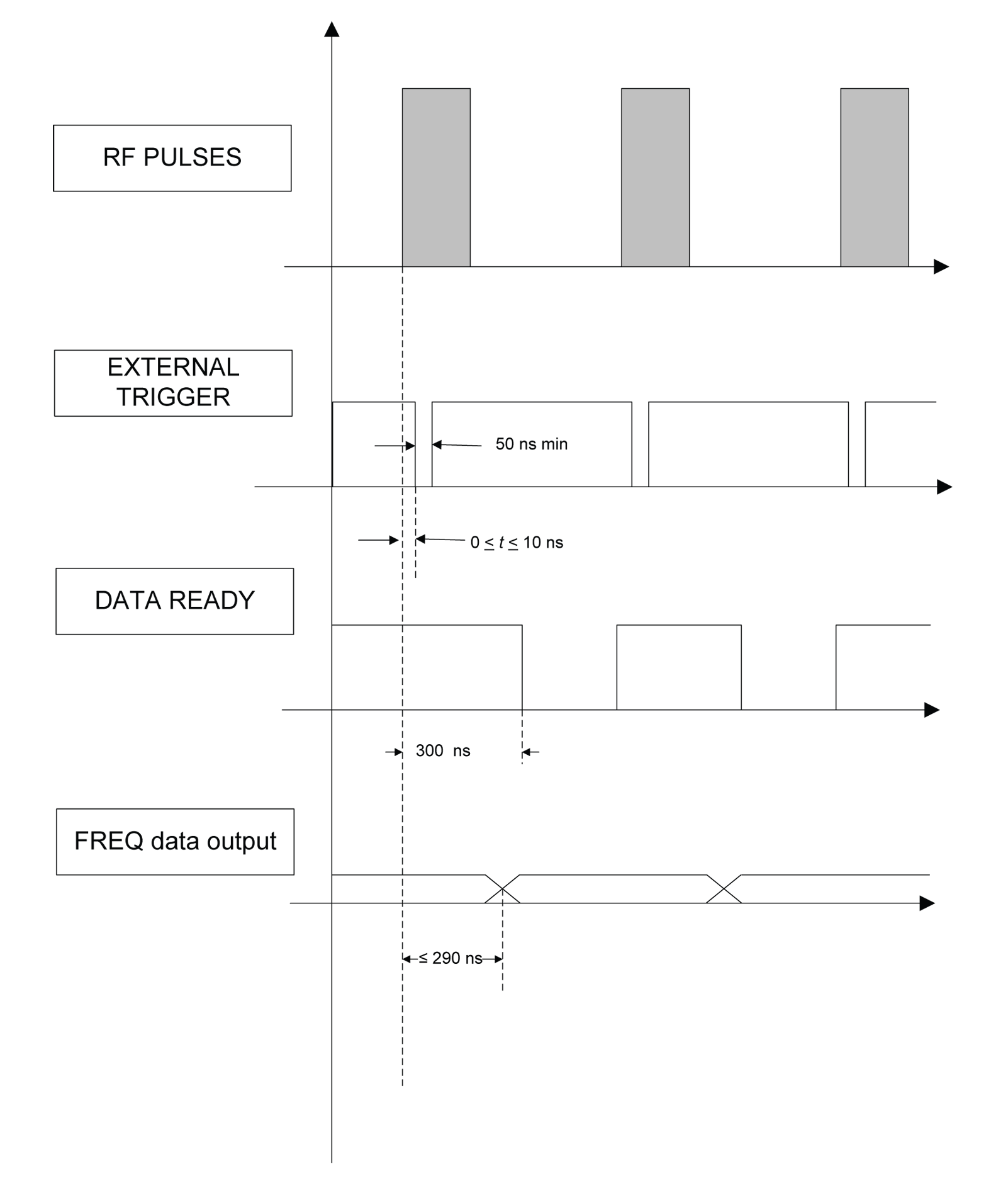 | Data Ready Output | TTL high initially. TTL low when the frequency data of input RF signal has settled. Nominal pulse width 100 nanoseconds. After 100 ns, TTL releases to high. |