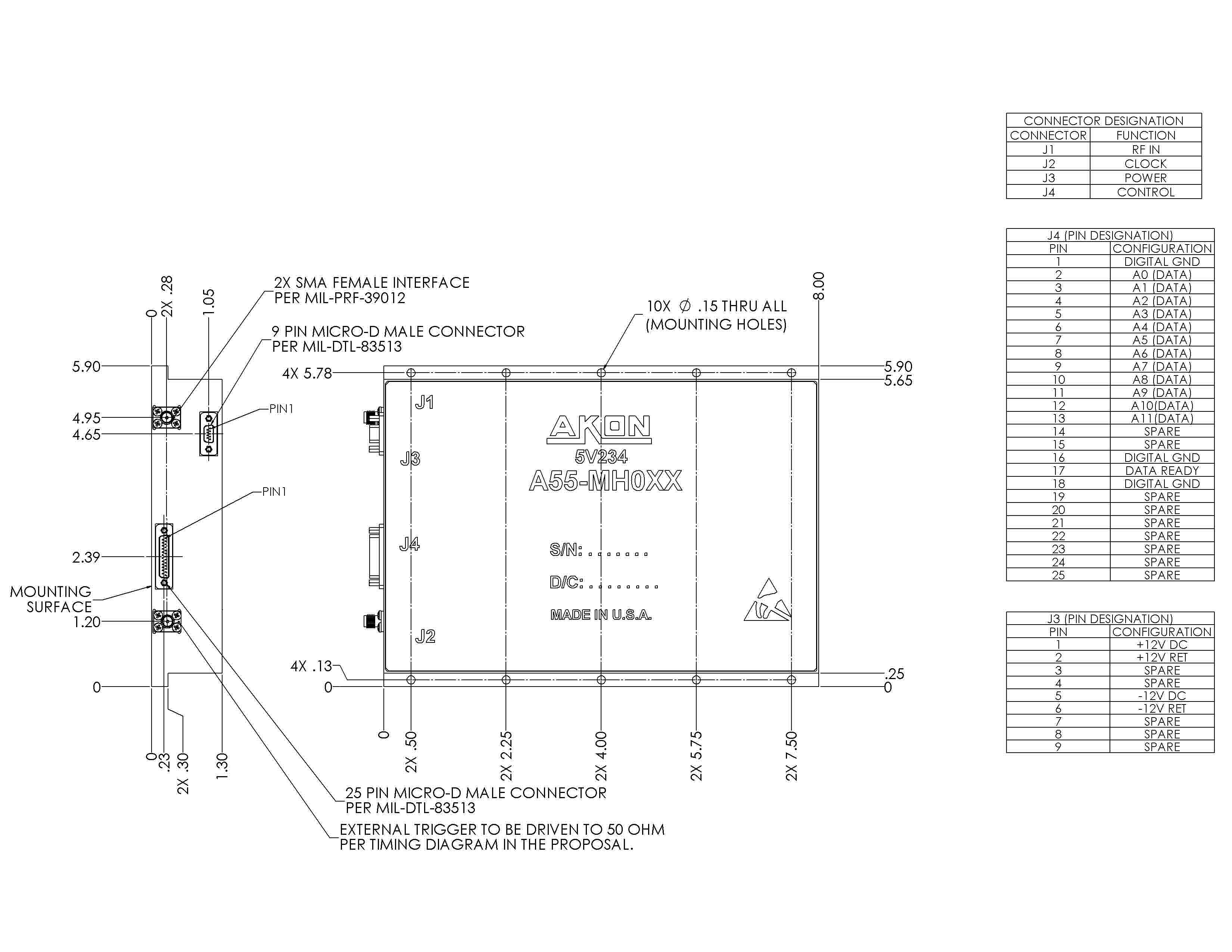 AKON is a leading manufacturer of RF Microwave Millimeter Wave Components and Subsystems. AKON has developed a new series of 12 BIT Digital Frequency Discriminators (DFD) covering the frequency range of 2-6, 6-18, and 2-18 GHz. 12 BIT resolution DFD’s exhibit high accuracy of 5 MHz RMS for 2-18 GHz, 3.5 MHz RMS for 6-18 GHz and exceptional 1.5 MHz RMS for 2-6 GHz. These DFD’s have been designed with input Band Pass Filters to eliminate high level out of band signals producing false output and Limiting Amplifiers with approximate 80 dB small signal RF gain with exceptional frequency flatness of ±2.0 dB, inclusive of input Band Pass Filter. Exceptionally Low frequency flatness has a direct effect on DFD sensitivity. With 4.0 dB total Noise Figure, effective operational sensitivity for 6-18 GHz band is -60 dBm.