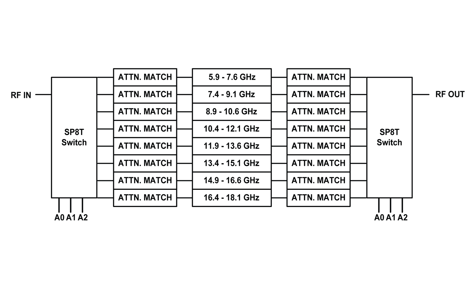 | Channels (GHz) | 8 Total: CH1: 5.9 - 7.6 CH2: 7.4 - 9.1 CH3: 8.9 - 10.6 CH4: 10.4 - 12.1 CH5: 11.9 - 13.6 CH6: 13.4 - 15.1 CH7: 14.9 - 16.6 CH8: 16.4 - 18.1 |