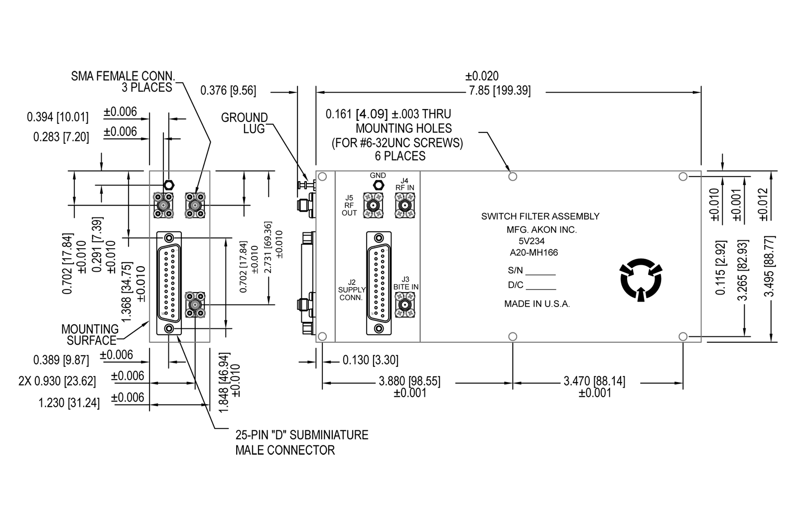 AKON is a leading manufacturer of a broad range of microwave components and integrated subassemblies in 0.5 to 20.0 GHz range. We specialize in concept through hardware realization of “custom” microwave components and integrated subassemblies (MIC and MMIC). The A20-MH166 is a 5-band RF amplifier and filter-preselector, which channelizes the 1.0 to 18 GHz band into 5 sub-bands of 1.0 to 2.0, 2.0 to 6.0, 6.0 to 10.0, 10.0 to 14.0 and 14.0 to 18.0 GHz. There are two inputs, one for the RF source and the other for a test signal input. the unit provides 35 dB of low noise gain. There is additionally included a DC coupled SDLA with TSS of -75 dBm which provides high speed detected video out. Applications include front-end preselection and video recovery for EW RWR and ELINT receivers. AKON can customize this product to the individual customer’s specific requirements.