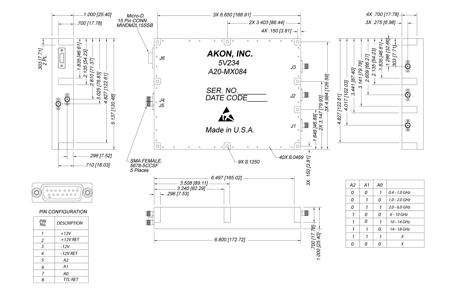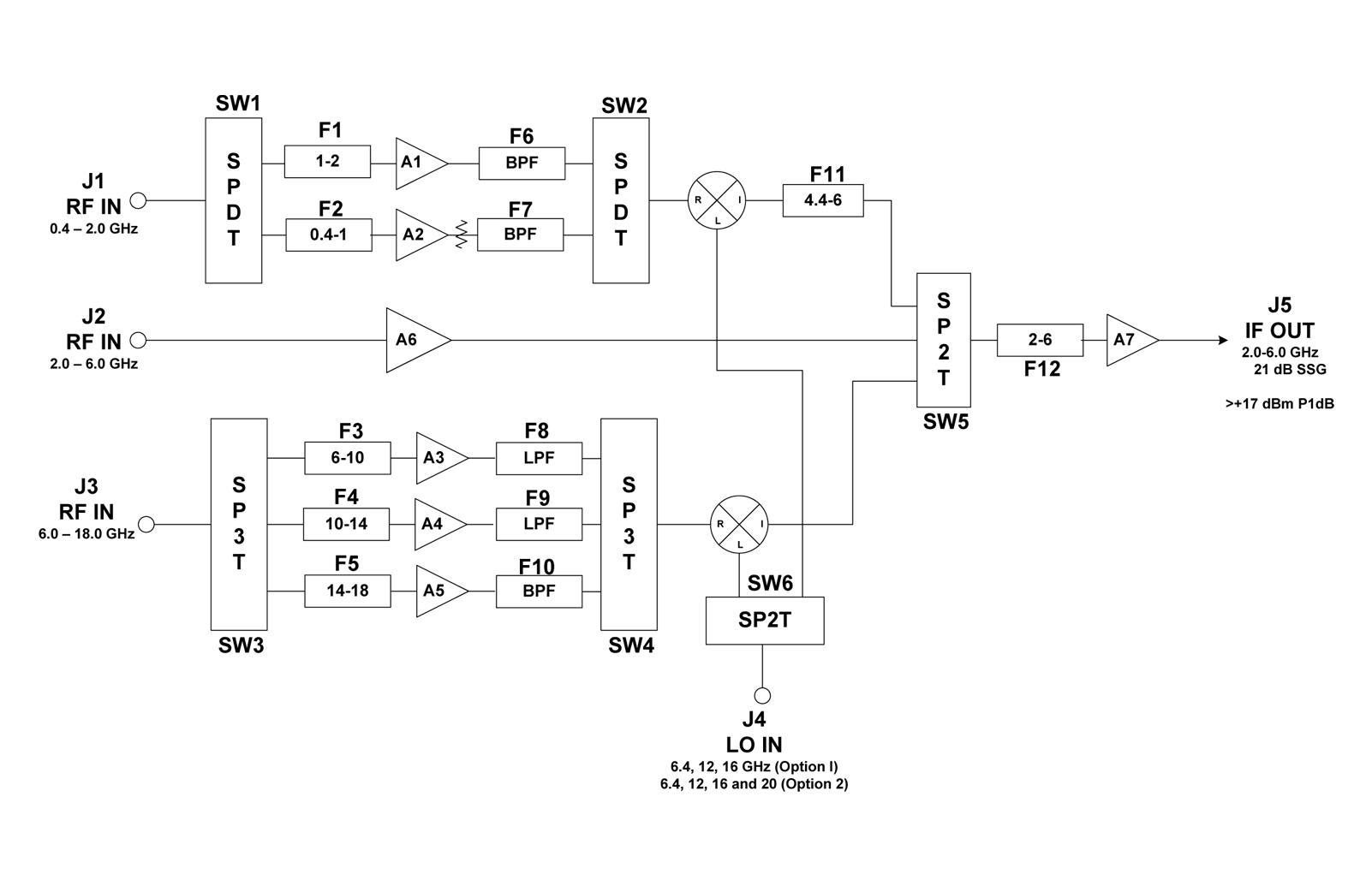 ?AKON’s A20-MX084 us an ultra wideband, three input 0.4 - 18 GHz combination up and down converter. Signals in the 0.4 to 2.0 band pass through a two channel filter preselector, and these channels are individually upconverted into the 2 to 6 GHz band. Signals in the 2 to 6 GHz band pass through the unit without frequency conversion, only amplification. Signals in the 6 to 18 GHz band pass through a three channel filter preselector and are then individually downconverted to the 2 to 6 GHz band. Input NF is band dependent and varies from 8.5 to 12 db. Conversion gain is 21 dB typical, and deselected channel isolation is typically 60 dB.