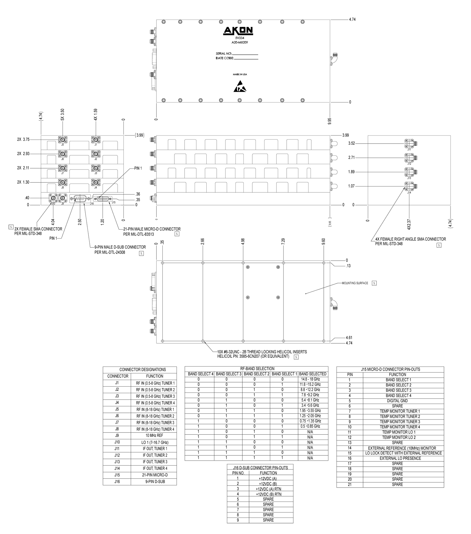 AKON’s A20-MX209 is a compact four channel tuner system that provides RF to IF conversion, pre-selection, and gain equalization. The modular design consists of 4 tuners, which each tuner handling 2 input bands from 0.5 - 18.0 GHz and 1 IF output at 1 GHz (single RF input from 0.5 - 18.0 also available) and features built-in LO1 amplification, filtering and multiplication using “high side” LOs. The unit also features an integrated DC-DC converter and LO presence and channel temperature monitoring.